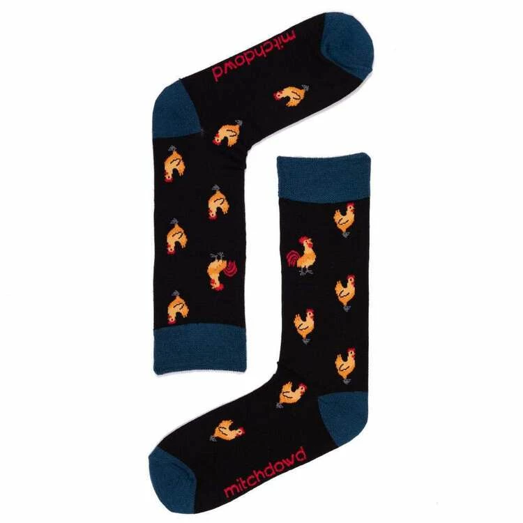 Look stylish in these fun Mitch Dowd Lucky Rooster Wool Socks, featuring a colour block design, contrast colour toe and heel and double ribbed cuff. Crafted from the finest Australian Merino Wool, these socks are also lightweight and soft and are perfect for staying warm or be given as a great gift to your loved ones or yourself.